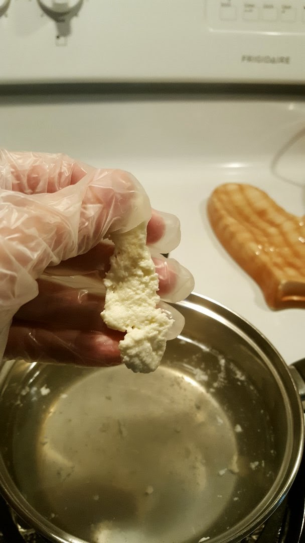 The one thing I did notice though is that during the cooking phase, the curds should stay at 105F. At one point, my thermometer jumped from 106F to 115F  :-\ ! so I quickly cooled it back to 105F by removing it from the heat source. This was about a lapse of 5 minutes. I included this tidbit just in case anyone thinks this is the reason it never stretched. But it doesn't explain my first attempt...just lost here.